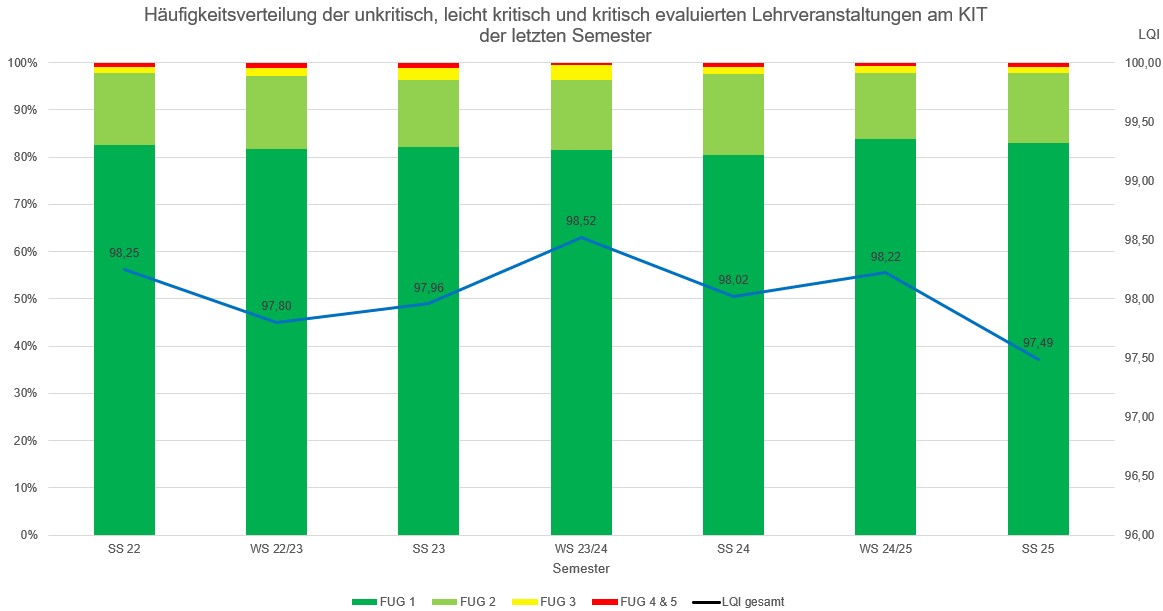 The Quality Management Department (STS-QM) prepares a semester report on course evaluation for each KIT department/teaching unit and makes it available to those responsible. This report contains information on all evaluated courses (e.g., the LQI). Based on this, the results and possible follow-up measures are discussed together with STS-QM.